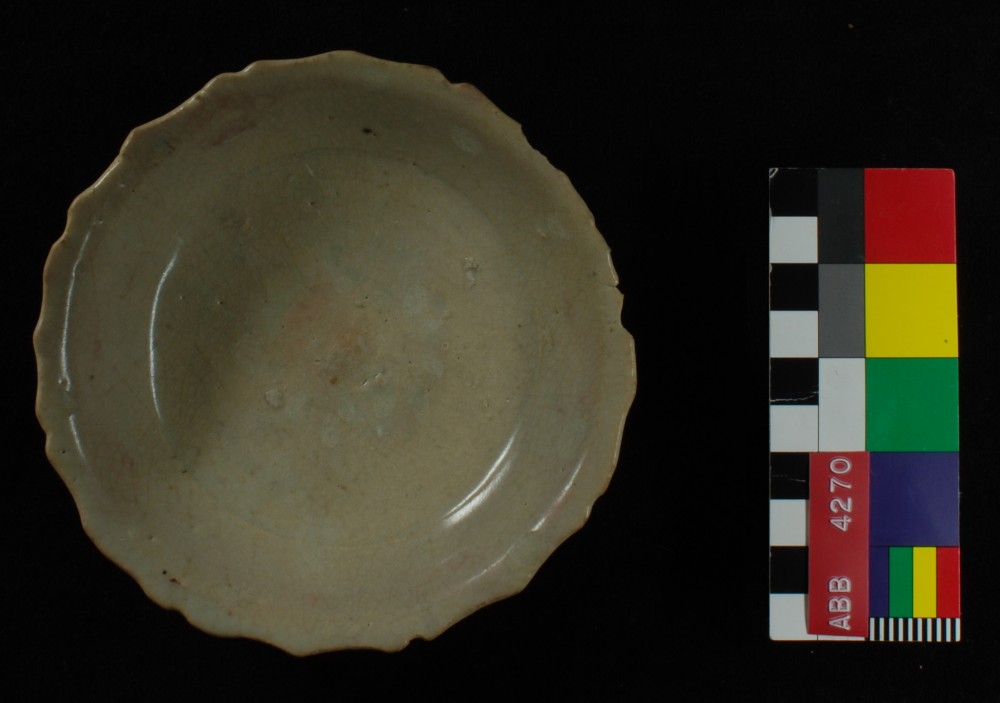 Saucer/dish with foliated rim, Ming period, celadon glaze with traces of enamel.