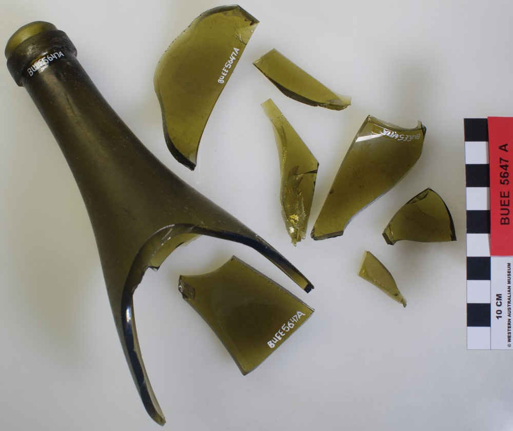 Bottle fragments, olive green. 1x neck and part shoulder + various fragments.