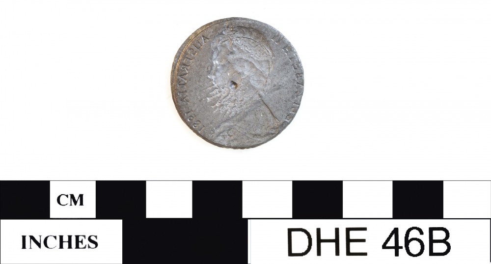 Negative impression of 10 cent piece dated to 1981 on one side and 1991 on other w/ head of ER II on both sides. On 1981 side punch hole evident in centre of coin where the coin has been pushed into ground using Phillips screw driver to make it appear as if in undisturbed deposit. Found in association with DHE 46A.