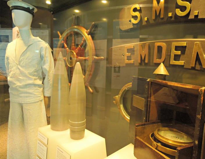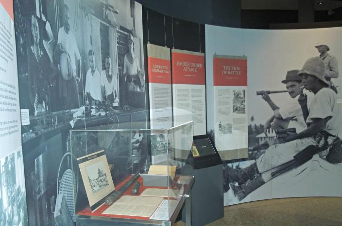 The Last Gentlemen of War - about the exhibition Katherine Veness's blog | Created 1 decade ago Last Gentlemen of War banner Image copyright WA Museum On 4 October 1913, the Royal Australian Navy Fleet arrived in Sydney to the cheers and admiration of thousands of onlookers. Among this impressive fleet was the HMAS Sydney, who would soon enter history and validate Australia’s investment in a navy of its own. Sydney was a ‘Chatham’ Class light cruiser; 140 m long, with a 15.2 m beam, an impressive artillery including machine guns and torpedo tubes, and a maximum speed of 26 knots (48 km/h). 376 crewmembers were employed to run the Sydney. Little did they know what impact they were to have on Australian history in just over a year. The German ship SMS Emden, in comparison, was just 118 m long, with a 13.4 m beam, 360 crewmembers, and a maximum speed of 23 knots (43 km/h). These specifications, as well as a less well-equipped artillery, would determine the fate of the Emden during its Indian Ocean trade-ship raiding regime. Display case showing various artefacts Image copyright WA Museum Display case from the exhibition Image copyright WA Museum The paths of the Emden and Sydney crossed on 9 November 1914, at Direction Island, in the Cocos (Keeling) Islands. The crew of the Emden had declared the island for Germany. A stroke of luck for the Australian ship Sydney meant that Emden captain Karl von Müller had no idea that the Sydney was steaming towards his ship’s exact location, just minutes after the call for help was sent from the island. Displays describing events of the battle Image copyright WA Museum Map display showing important locations Image copyright WA Museum Learn what happens next as the battle between the Sydney and Emden unfolds, and what events led up to the now famous wireless message from the Sydney: Emden beached and done for. Text panel from the exhibition Image copyright WA Museum The Last Gentlemen of War is open to the public at the Western Australian Maritime Museum from 7 November 2014 – 26 April 2015. Please visit the website for more information.
