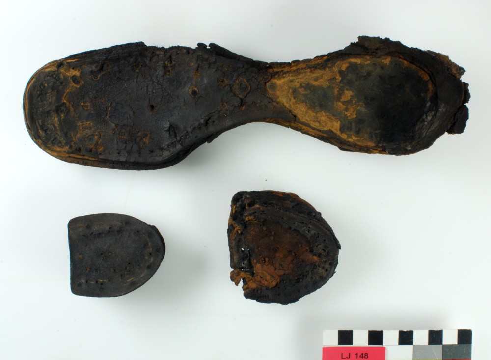 Shoe: leather (right), w/ 7x additional pieces (incl. 2x heel sections).