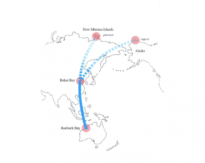 The story of the Red Knot band number 052-65648Article | Updated 10 months ago Red Knot (Western Australian Museum registered specimen A39016) WA Museum Among the most extreme cases of long distance flights are those performed by the shorebirds. Many of these breed in the high latitudes of the Arctic tundra of the northern hemisphere. The 24 hours of daylight and the abundant food supplies in this region are however short-lived and these birds must soon depart the Arctic ahead of the severity of the winter. They fly southwards, thousands of kilometres and for many, their destination is Australia. The Red Knot is one of the most colourful of our waders and it makes one of the longest yearly migrations of any bird, travelling 15,000 km from its Arctic breeding grounds to Australia and then for many, moving on to New Zealand. Most arrive in Australia in August-September and depart for the return journey back to their breeding grounds in April. Noteworthy is the fact that the adults depart the breeding quarters before their newly hatched juveniles who must find their own way to Australia! On 4 March 2015, Grant Lodge of Kununurra found a recently dead shorebird on a beach near Broome. The bird had a number of bands and leg flags and realising its possible importance to science, he froze the specimen and contacted Ron Johnstone, Curator of Ornithology at the Western Australian Museum. The specimen was sent to the museum, prepared into a research study skin (registered number A39016), and identified as Red Knot Calidris canutus piersmai one of the world’s long distance migrants. It was a female, length 251 mm and weight 121 g with extensive body and subcutaneous fat (obviously ready to migrate back to its breeding quarters). This body fat is the ‘fuel‘ shorebirds, such as this, ‘burn’ during this non-stop migration. The Red Knot has the ability to build up its body fat (up to 30% its body weight) in a few weeks, but to do so it requires abundant food supply. Its main food includes small marine worms, bivalves, gastropods and crustaceans that abound on the intertidal mudflats and sandflats of the Eighty Mile Beach in Western Australia and the shores of the Yellow Sea region in China and Korea. Red Knot Migration Patterns Image copyright WA Museum Judging from its injuries, small puncture marks in the head and neck, it had probably been killed by a bird of prey. Its recovery and preparation into a museum research specimen has provided us with a great deal of information on its body condition, its sex, age, plumage and its subspecific identity. The story does not end there as information derived from banding, flagging and geolocation programs has enabled researchers to determine the region of origin of many of these birds and highlight the importance of global flight paths and stop-over areas that are of international significance for shorebirds. Details of the bands – alloy band number 052-65648 and three yellow bands on left leg and a red plastic band above a green band on the right leg – were sent to the Australian Bird and Bat Banding office in Canberra and the history of its migrations were revealed. Colour bands and leg flags help identify individual birds in the field using different colour combinations. This bird was not fitted with a geolocation device which has the ability to record the bird’s location and the data can then be downloaded when it is re-captured. This Red Knot was fitted with band number 052-65648 and distinctive colour bands at Eagles Roost, Roebuck Bay, Broome, Western Australia on 1 August 2010. It was observed on numerous occasions in Roebuck Bay between 18 February 2011 and 25 April 2011. By 30 May 2011, it was observed at Nan Pu, Bohai Bay, China and by the 3 September that year had returned to Roebuck Bay in north-western Australia. It was again observed on numerous occasions in Roebuck Bay between September 2011 and 25 April 2012 and was then recorded back at Nan Pu, China, on 23 May 2012. By 14 September 2012 it was back at Roebuck Bay and remained there until the last sighting on 22 April 2014. On 17 May 2014, it was observed at North Beipu, Bohai Bay, China where it remained until 22 May, no doubt ‘re-fuelling’ before flying further north to breed. The next observation was back at Roebuck Bay on 13 September 2014. There were several other observations at Roebuck Bay and the Eighty Mile Beach in September, October and December 2014 and in February 2015 until its death in March 2015. In the five years since being caught and banded, this Red Knot had been observed on 60 occasions in north-western Australia and 6 times in China. Shorebirds worldwide are declining and their habitats are under threat in many areas from industrial development and global climate change. Current researchers working on the Global Flyway Network are using the Red Knot as a flagship species as part of the program. Information from specimens such as 052-65648 will help provide a wealth of information on the migration and movements at these sites of international importance in both Australia and overseas to preserve shorebird numbers in a rapidly changing world. Red Knot 052-65648 also highlights the value and involvement of the general public in finding and reporting banded birds and the role of the Western Australian Museum, the Global flyway Network and the Australian Bird and Bat Banding Scheme in research and conservation. WA Museum Ornithology Curator Ron Johnstone