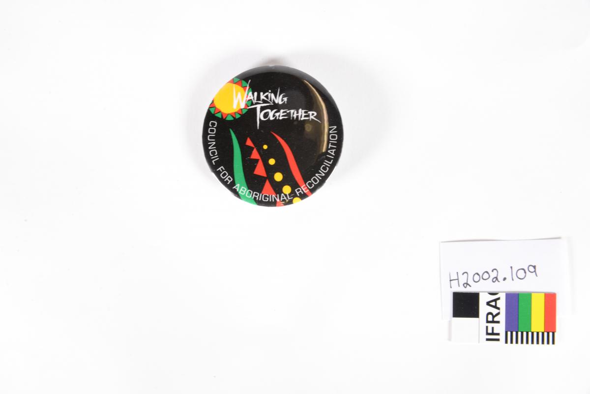 Black badge - paper face with plastic coating and stainless steel metal backing. Badge has black background with image of yellow and red sun on green background, and a parth below it with red edges and yellow dots inside path. A green leave or path next to it. Printed in white "WALKiNG TOGETHER/COUNCIL FOR ABORIGINAL RECONCILIATION". Back of badge has a pin in centre to fasten.