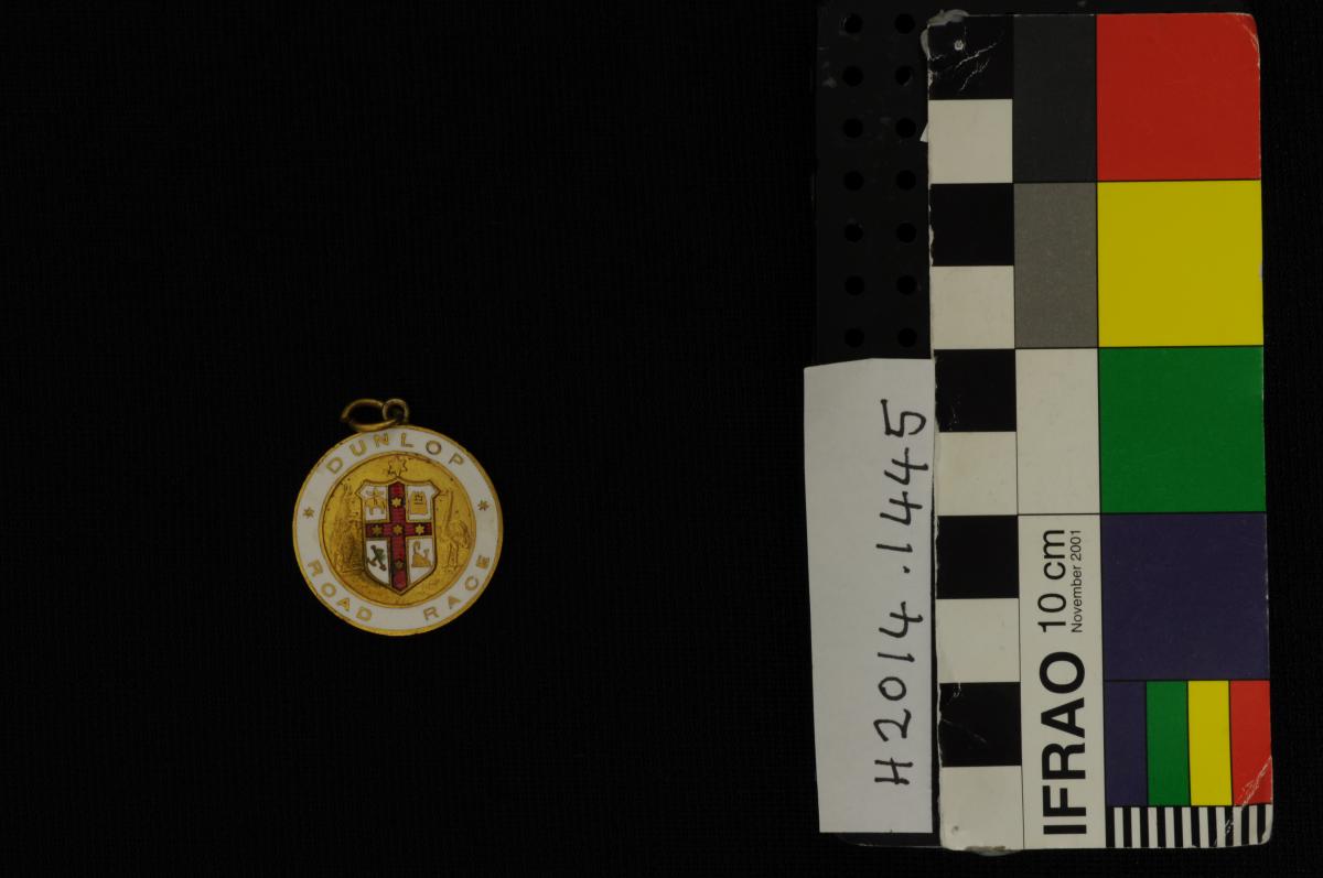 Gold round cycling time medallion. Metal with red and white enamel. Obverse; 'BEVERLEY - PERTH TIME MEDALLION', 'WON BY/ H. MARSHALL/ 1923/ 6 HRS/ 1 MNS/ 12 SDS'.