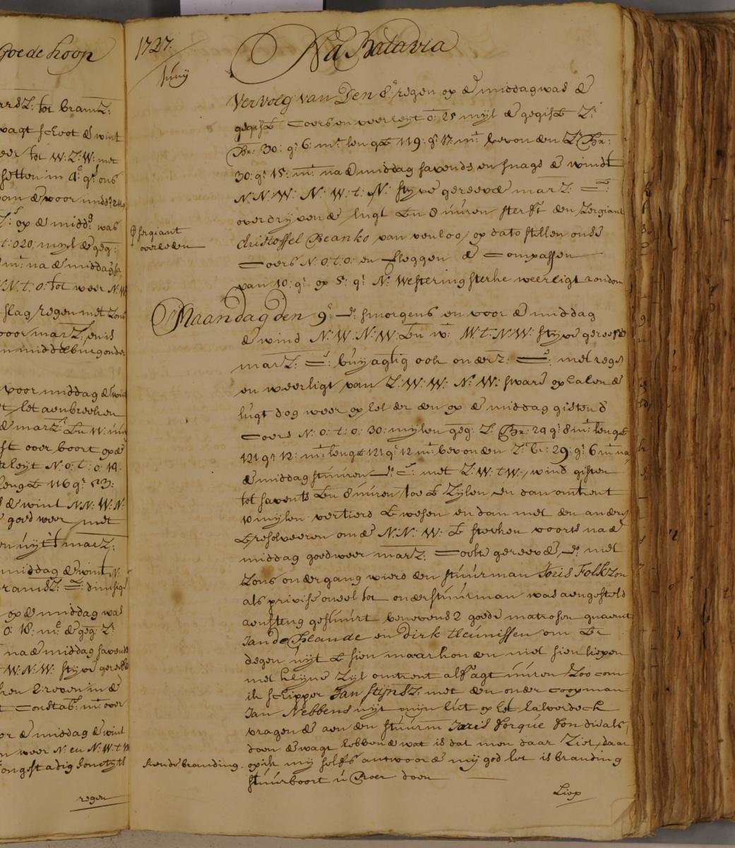 the 9th: do: In the morning and before the noon the wind at N:W: N:W: by W: W: by N: W: stiff reefed topS: Brze: showery also lower Crses Brze: with rain and lightning at S:W: W:, N:W: heavy gathering sky but again clearing at midday accounted the course N:E: by E: 30 miles accounted S: Lat: 29 degs: 8 mts: longitude 121 degs: 12 mts: found S: Lat: 29: degs: 6 mts: after the midday steered Crse: with S:W: by W: wind accounted to sail until the evening at 8 o’clock and to have then traversed 10 miles and then to resolve with the others to stand at N:N:W: further after noon good weather topS: breeze reefed do: with sunset the steersman Joris Folkson provisionally appointed as under steersman was sent to the topmast besides 2 good sailors called Jan de Bolande and Dirk Theunissen to thoroughly look out but could see nothing plied under shortened sail about half to eight o’clock So come I skipper Jan Steijns with the under merchant Jan Nebbens out of my hut onto the half deck asking the steersman Joris Forqueson who as then had the watch what is that one sees over there, upon which answering myself my God it are breakers Starboard your Rudder then—