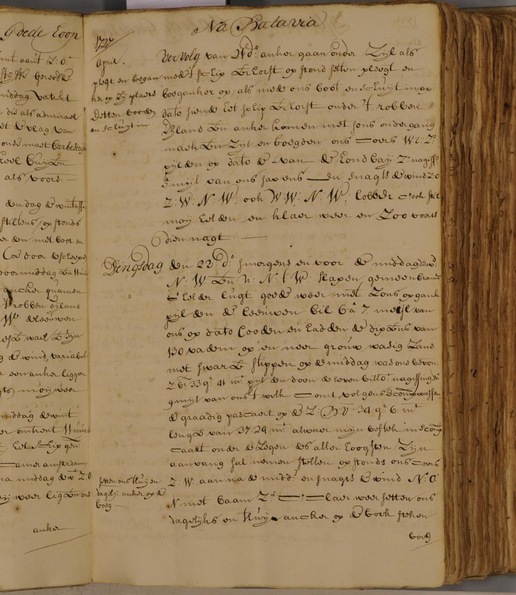 boegsmorgens en voor de middag de wd: N:W: ten N: N:t W: slap en gemeen bramZl: C⁰: helder lugt goede weer met zonsopgang pijlden de leeuwen bil 6 â 7 meijl van ons op dato looden en hadden de di[e]ptens van 130 vadem op en neer grouw wasig zand met swarte stippen op de middag was ons bevon: Z: br: 33 gr: 41 mt: pilden doen de leuenbill Ot: na gissing 8 â 9 mijl van ons 't welk comt volgens 's Comp: wassen- de graadig pascaert op de Z:B: v: 34 gr: 6 mt: lengte van 37. 24 mt: alwaer mijn bestek in 's comp: Caart onder de Zegen des allerhoogsten zijn aanvang sal nemen stellen opstond ons Coers Z:W: aan na de middg: en snagts de wind N:O: N: met bramZls: C⁰: claer weer setten ons dagelijks en thuij ancker op de boech steeken boeg