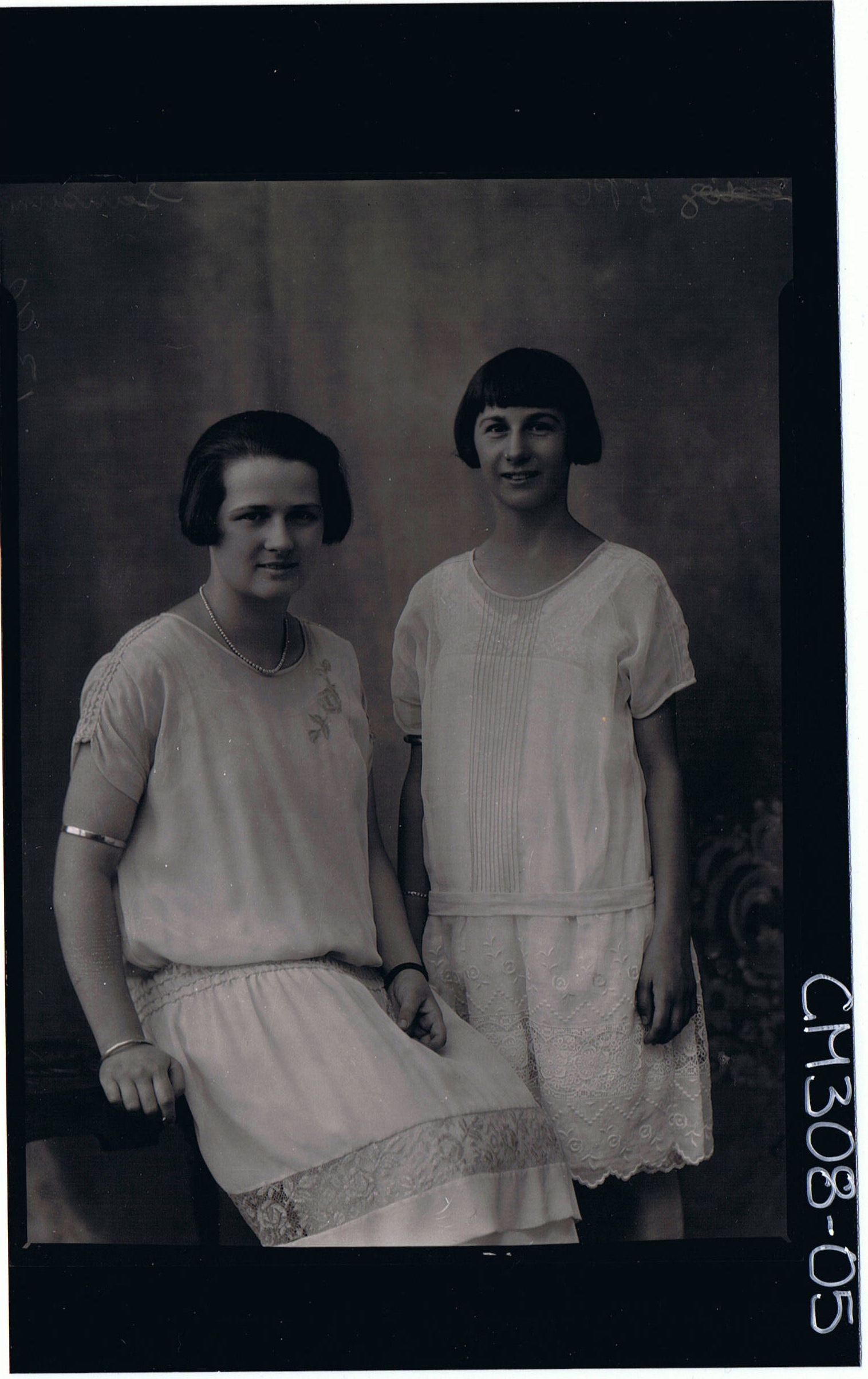 3/4 Portrait of woman seated, wearing lace dress, teenage girl standing, wearing knee length lace dress; 'Sansum'
