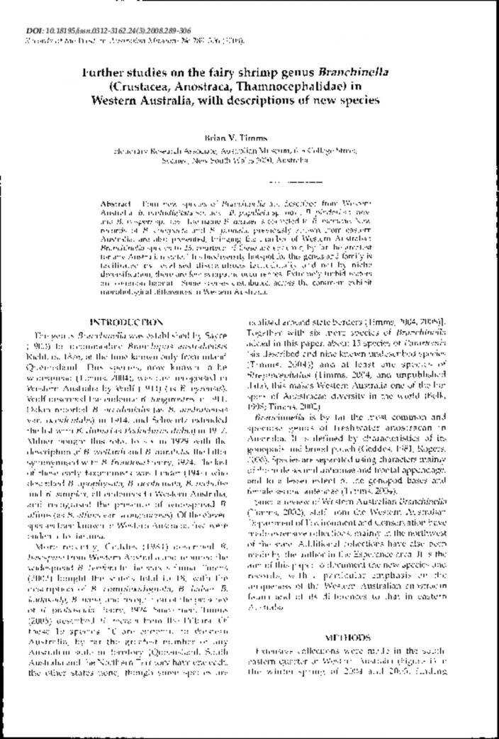 Further studies on the fairy shrimp genus Branchinella (Crustacea, Anostraca, Thamnocephalidae) in Western Australia, with descriptions of new speciesWA Museum Records and Supplements | Updated 9 years agoABSTRACT – Four new species of Branchinella are described from Western Australia: B. multidigitata sp. nov., B. papillata sp. nov., B. pinderi sp. nov. and B. vosperi sp. nov. The name B. mcraei is corrected to B. mcraeae. New records of B. compacta and B. pinnata, previously known from eastern Australia, are also presented, bringing the number of Western Australian Branchinella species to 25. Fourteen of these are endemic, by far the greatest for any Australian state. This biodiversity hotspot for this genus and family is tacilltated by localised distributions latitudinally and not by niche diversificatior; there are few sympatric occurrences. Extremely turbid waters are common habitats. Some species distributed across the continent exhibit morphological differences in Western Australia. Author(s) Brian V. Timms Volume Records 24 : Part 3 Article Published 2008 Page Number 289 DOI 10.18195/issn.0312-3162.24(3).2008.289-306 Further studies on the fairy shrimp genus Branchinella (Crustacea, Anostraca, Thamnocephalidae) in Western Australia, with descr Download 2.72 MB To request an accessible version of this pdf please email onlineservices@museum.wa.gov.au