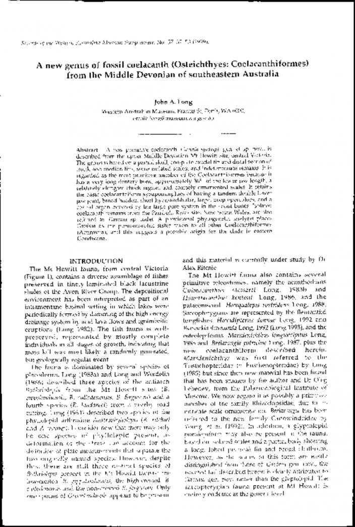 A new genus of fossil coelacanth (Osteichthyes: Coelacanthiformes) from the Middle Devonian of southeastern AustraliaWA Museum Records and Supplements | Updated 1 decade agoAbstract: A new primitive coelacanth Gavinia syntrips gen. et sp. nov., is described from the upper Middle Devonian Mt Howitt site, central Victoria. The genus is based on a partial skull, complete caudal fin and distal section of trunk and median fins, some isolated scales, and indeterminate remains. It is regarded as the most primitive member of the Coelacanthiformes because it has a very long dentary bone, approximately 36% of the lower jaw length, a relatively elongate cheek region, and coarsely omamented scales. It retains the basic coelacanthiform synapomorphies of having a tandem double lower jaw joint; broad-headed, short hyomandibular; large, deep operculum; and a rostra I organ denoted by the large pore system in the snout bones. Isolated coelacanth remains from the Pambula River site, New South Wales, are also referred to Gavinia sp. indet. A provisional phylogenetic analysis places Gavinia as the plesiomorphic sister taxon to all other Coelacanthiformes (Actinistia), and this suggests a possible origin for the clade in eastern Gondwana. Author(s) John A. Long : Part 1 Page Number 37 A new genus of fossil coelacanth (Osteichthyes: Coelacanthiformes) from the Middle Devonian of southeastern Australia Download 5.77 MB To request an accessible version of this pdf please email onlineservices@museum.wa.gov.au