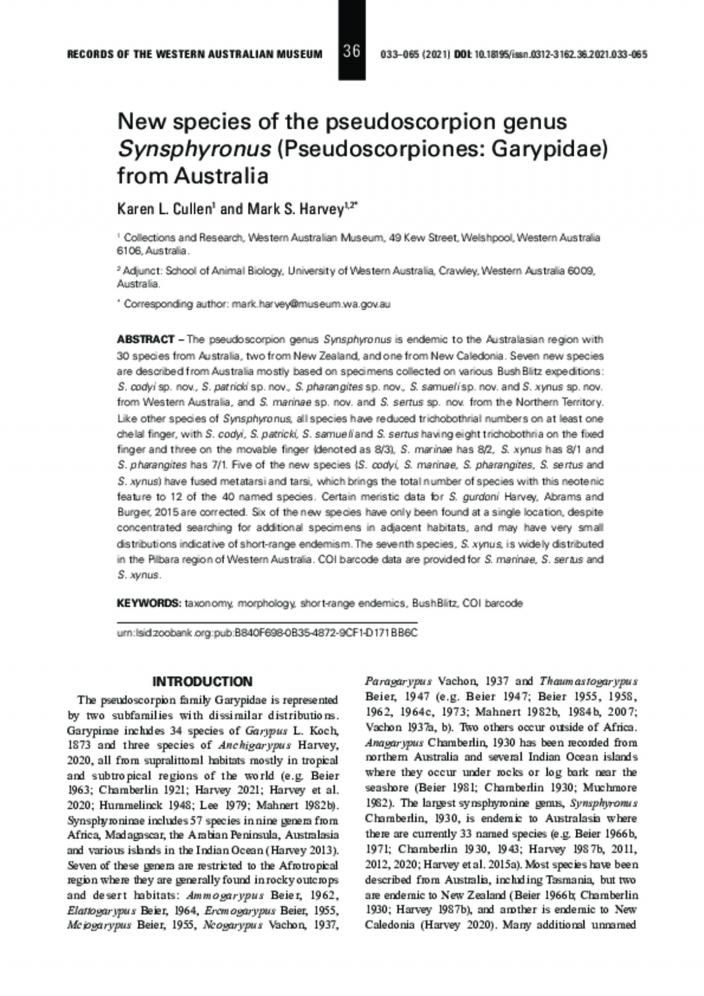 New species of the pseudoscorpion genus Synsphyronus (Pseudoscorpiones: Garypidae) from AustraliaWA Museum Records and Supplements | Updated 4 years agoABSTRACT – The pseudoscorpion genus Synsphyronus is endemic to the Australasian region with 30 species from Australia, two from New Zealand, and one from New Caledonia. Seven new species are described from Australia mostly based on specimens collected on various BushBlitz expeditions: S. codyi sp. nov., S. patricki sp. nov., S. pharangites sp. nov., S. samueli sp. nov. and S. xynus sp. nov. from Western Australia, and S. marinae sp. nov. and S. sertus sp. nov. from the Northern Territory. Like other species of Synsphyronus, all species have reduced trichobothrial numbers on at least one chelal finger, with S. codyi, S. patricki, S. samueli and S. sertus having eight trichobothria on the fixed finger and three on the movable finger (denoted as 8/3), S. marinae has 8/2, S. xynus has 8/1 and S. pharangites has 7/1. Five of the new species (S. codyi, S. marinae, S. pharangites, S. sertus and S. xynus) have fused metatarsi and tarsi, which brings the total number of species with this neotenic feature to 12 of the 40 named species. Certain meristic data for S. gurdoni Harvey, Abrams and Burger, 2015 are corrected. Six of the new species have only been found at a single location, despite concentrated searching for additional specimens in adjacent habitats, and may have very small distributions indicative of short-range endemism. The seventh species, S. xynus, is widely distributed in the Pilbara region of Western Australia. COI barcode data are provided for S. marinae, S. sertus and S. xynus. Author(s) Karen L. Cullen and Mark S. Harvey Volume Records 36 : — Article Published 2021 Page Number 33 DOI 10.18195/issn.0312-3162.36.2021.033-065 New species of the pseudoscorpion genus Synsphyronus (Pseudoscorpiones: Garypidae) from Australia Download 4.53 MB To request an accessible version of this pdf please email onlineservices@museum.wa.gov.au