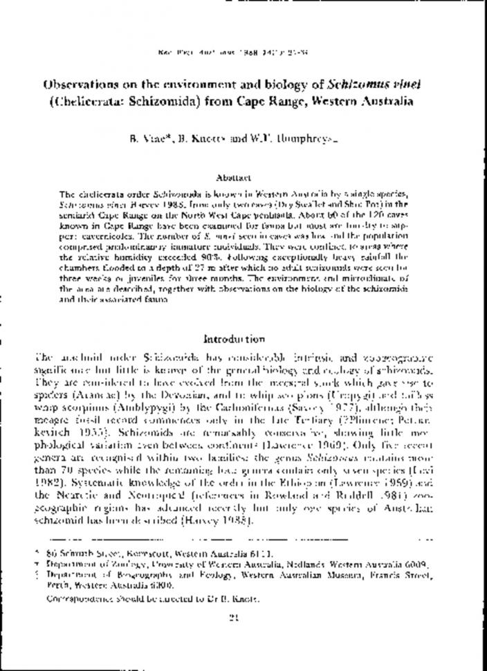 OBSERVATIONS ON THE ENVIRONMENT AND BIOLOGY OF SCHIZOMUS VINEI (CHELICERATA SCHIZOMIDA) FROM CAPE RANGE, WESTERN AUSTRALIAWA Museum Records and Supplements | Updated 1 decade agoAbstract: The chelicerata order Schizomida is known in Western Australia by a single species, Schizumus vinei Harvey 1988, from only two caves (Dry Swallet and Shot Pot) in the semiarid Cape Range on the North West Cape peninsula. About 60 of the 120 caves known in Cape Range have been examined for fauna but most are too dry to support cavernicoles. The number of S. vinei seen in caves was low and the population comprised predominantly immature individuals. They were confined to areas where the relative humidity exceeded 90%. Following exceptionally heavy rainfall the chambers flooded to a depth of 27 m after which no adult schizomids were seen for three weeks or juveniles for three months. The environment and microclimate of the area are described, together with observations on the biology of the schizomids and their associated fauna. Author(s) VINE, B., KNOTT, B., HUMPHREYS, W.F. : Part 1 Page Number 21 OBSERVATIONS ON THE ENVIRONMENT AND BIOLOGY OF SCHIZOMUS VINEI (CHELICERATA SCHIZOMIDA) FROM CAPE RANGE, WESTERN AUSTRALIA Download 1.28 MB To request an accessible version of this pdf please email onlineservices@museum.wa.gov.au