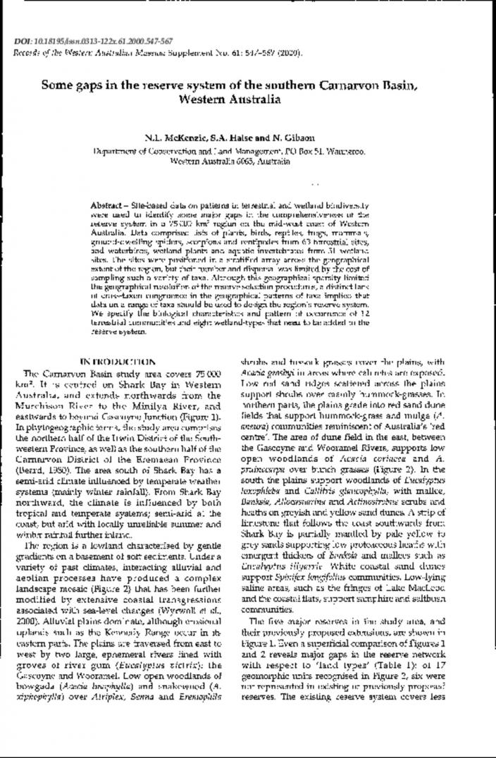Some gaps in the reserve system of the southern Carnarvon Basin, Western AustraliaWA Museum Records and Supplements | Updated 9 years agoABSTRACT – Site-based data on patterns in terrestrial and wetland biodiversity were used to identify some major gaps in the comprehensiveness of the reserve system in a 75000 km2 region on the mid-west coast of Western Australia. Data comprised lists of plants, birds, reptiles, frogs, mammals, ground-dwelling spiders, scorpions and centipedes from 63 terrestrial sites, and waterbirds, wetland plants and aquatic invertebrates from 51 wetland sites. The sites were positioned in a stratified array across the geographical extent of the region, but their number and dispersal was limited by the cost of sampling such a variety of taxa. Although this geographical sparsity limited the geographical resolution of the reserve selection procedures, a distinct lack of cross-taxon congruence in the geographical patterns of taxa implied that data on a range of taxa should be used to design the region's reserve system. We specify the biological characteristics and pattern of occurrence of 12 terrestrial communities and eight wetland-types that need to be added to the reserve system. Author(s) N.L. McKenzie, S.A. Halse and N. Gibson Volume Supplement 61 : Biodiversity of the southern Carnarvon Basin Article Published 2000 Page Number 547 DOI 10.18195/issn.0313-122x.61.2000.547-567 Some gaps in the reserve system of the southern Carnarvon Basin, Western Australia Download 6.6 MB To request an accessible version of this pdf please email onlineservices@museum.wa.gov.au