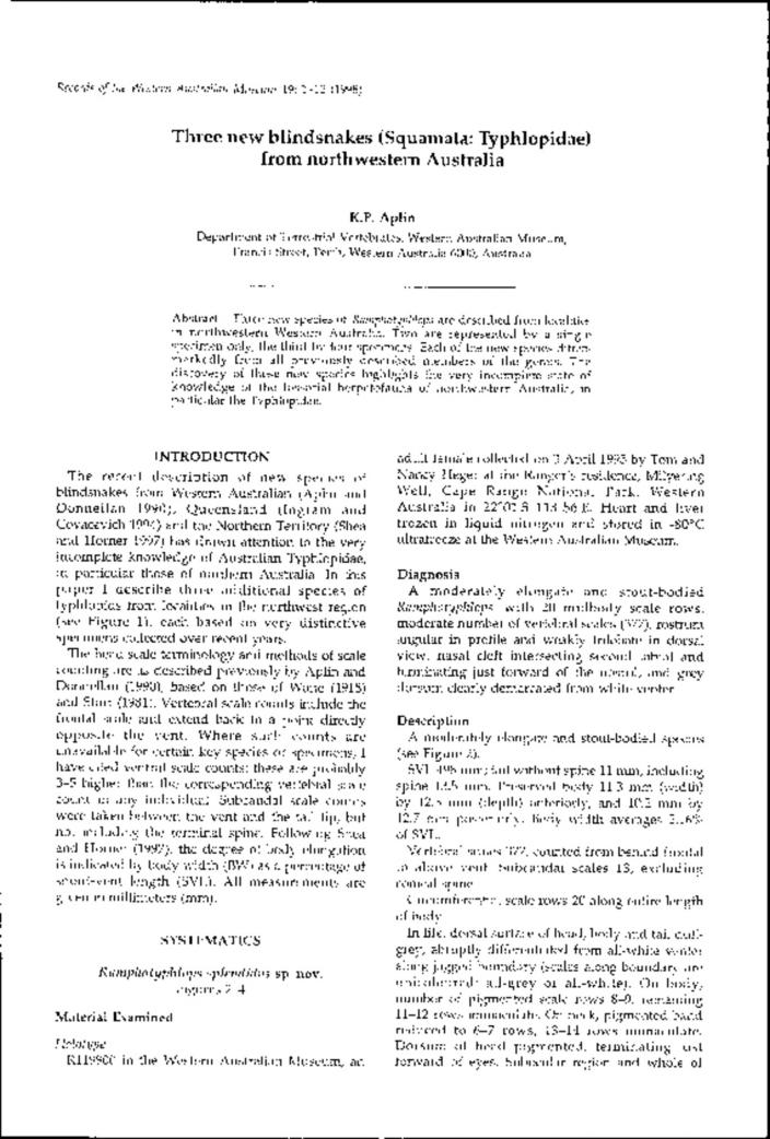 THREE NEW BLINDSNAKES (SQUAMATA TYPHLOPIDAE) FROM NORTHWESTERN AUSTRALIAWA Museum Records and Supplements | Updated 1 decade agoAbstract - Three new species of Ramphotyphlops are described from localities in northwestern Western Australia. Two are represented by a single specimen only, the third by four specimens. Each of the new species differs markedly from all previously described members of the genus. The discovery of these new species highlights the very incomplete state of knowledge of the fossorial herpetofauna of northwestern Australia, in particular the Typhlopidae. Author(s) APLIN, K.P. : Part 1 Page Number 1 THREE NEW BLINDSNAKES (SQUAMATA TYPHLOPIDAE) FROM NORTHWESTERN AUSTRALIA Download 4 MB To request an accessible version of this pdf please email onlineservices@museum.wa.gov.au