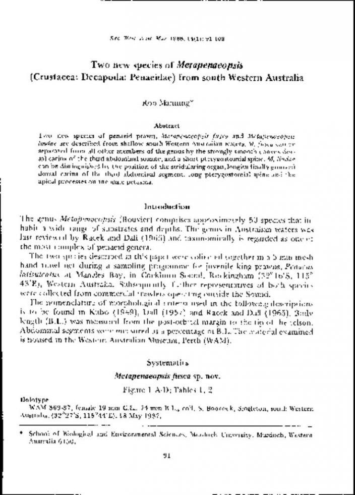 TWO NEW SPECIES OF METAPENAEOPSIS (CRUSTACEA DECAPODA PENAEIDAE) FROM SOUTH WESTERN AUSTRALIAWA Museum Records and Supplements | Updated 1 decade agoAbstract: Two new species of penaeid prawn, Metapenaeopsis fusca and Metapenaeopsis lindae are described from shallow south Western Australian waters, M. fusca can be separated from all other members of the genus by the strongly smooth convex dorsal carina of the third abdominal somite, and a short pterygostomial spine, M. lindae can be distinguished by the position of the stridulating organ, longitudinally grooved dorsal carina of the third abdominal segment, long pterygostomial spine and the apical processes on the male petasma, Author(s) MANNING, ROB : Part 1 Page Number 91 TWO NEW SPECIES OF METAPENAEOPSIS (CRUSTACEA DECAPODA PENAEIDAE) FROM SOUTH WESTERN AUSTRALIA Download 1.05 MB To request an accessible version of this pdf please email onlineservices@museum.wa.gov.au