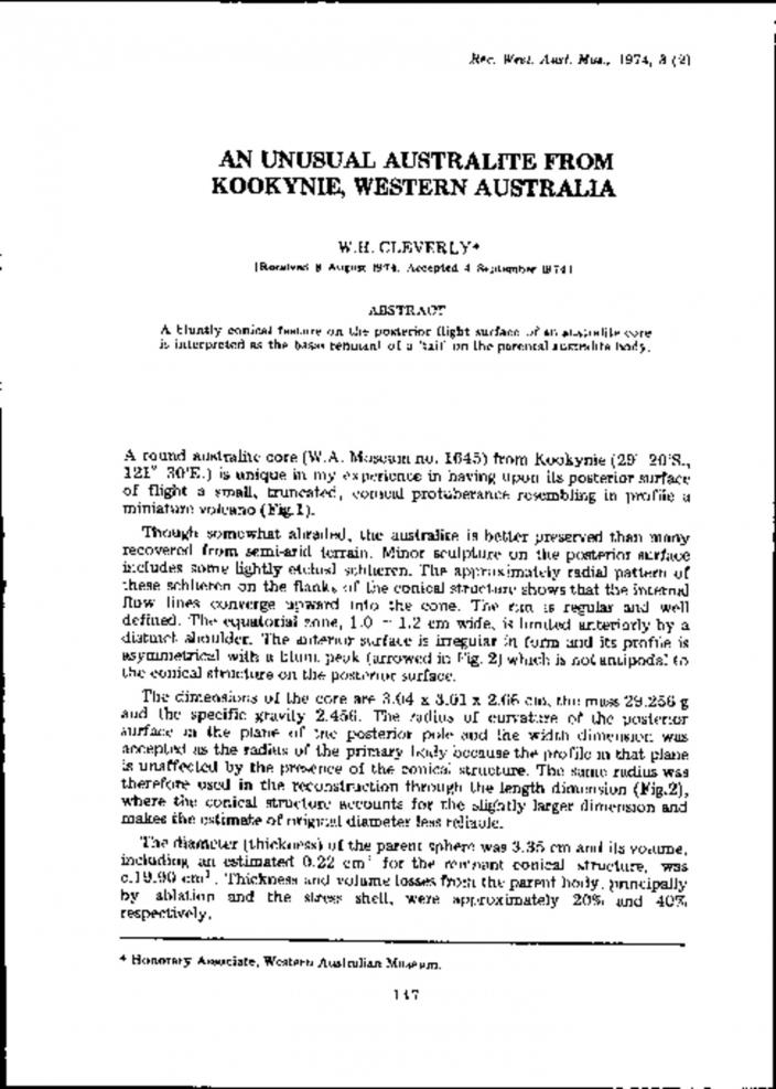 AN UNUSUAL AUSTRALITE FROM KOOKYNIE, WESTERN AUSTRALIAWA Museum Records and Supplements | Updated 1 decade agoAN UNUSUAL AUSTRALITE FROM KOOKYNIE, WESTERN AUSTRALIA Author(s) CLEVERLY, W.H. : Part 2 Page Number 147 AN UNUSUAL AUSTRALITE FROM KOOKYNIE, WESTERN AUSTRALIA Download 1023.67 KB To request an accessible version of this pdf please email onlineservices@museum.wa.gov.au