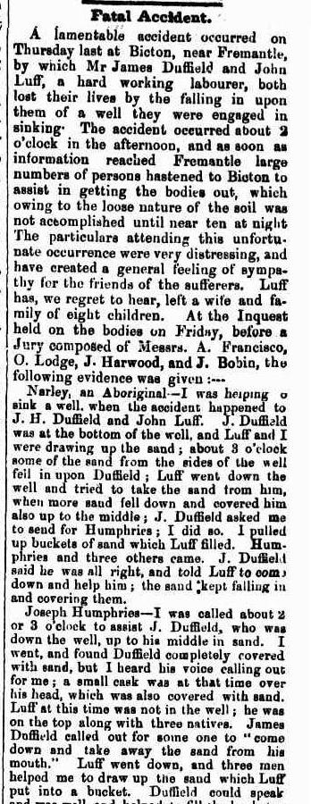 John Luff came to Fremantle as a convict (Convict 98). In 1852 his wife Mary Ann and three children, Elizabeth, John and Mary Charlotte arrived on the 'Anne Maclean'. John and Mary had three more children, Thomas, Harriet and Peter. The family farmed a small property which they leased in Bicton. He died in an earthfall at Bicton while sinking a well for a neighbour.